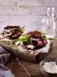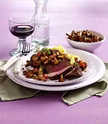 In the meantime, cut the fat side of the meat with a sharp little knife. Heat 1 tablespoon of oil in a pan and fry the meat for 3-5 minutes on each side, depending on its thickness. Season with salt and pepper. Remove meat from the pan, cover with aluminium foil and leave to rest for 10-15 minutes. Deglaze frying pan with 100 ml water and boil off