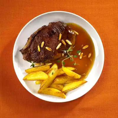 Remove, season with salt and pepper and keep warm. Deglaze frying fat with hot broth. Add garlic, tangerine juice and honey, simmer for 1-2 minutes. Add vinegar, stir in sauce thickener. Season sauce with salt and pepper. Arrange rump steaks with sauce and potatoes. Sprinkle with pine nuts and garnish with thyme