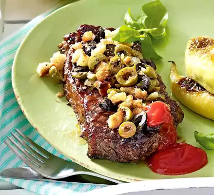 Cut the fat edge of the steaks. Grill the steaks on each side for 3-4 minutes. Season with salt and pepper. To serve, mix bread cubes with olives and sprinkle over steaks. Serve with toasted flat bread, pointed peppers, herb satsiki and BBQ sauce.