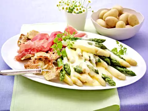 Drain the asparagus well. Serve with sauce hollandaise, the different kinds of ham and bacon. Garnish with chervil. Small new potatoes in the skin taste good with it.