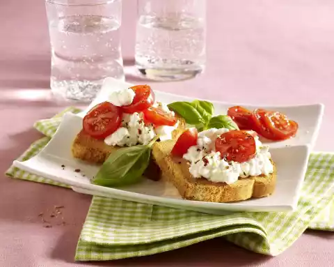 Wash, clean and slice the tomatoes. Cover rusk with cottage cheese and about 1/3 of the tomatoes. Add the rest of the tomatoes. Season with salt and pepper. Serve garnished with basil.