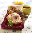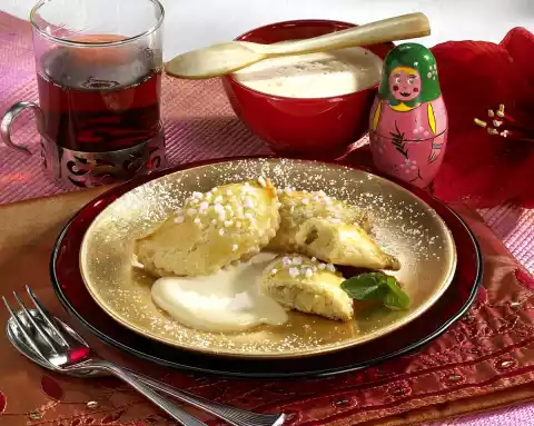Roll out the dough on a floured work surface, cut out 12 circles (8 cm Ø). Spread circles thinly with egg. Place a small heap of stewed apples on each circle. Fold the dough into pockets, press the edges well together. Put the piroschkis on a baking tray lined with baking paper. Brush with the rest of the egg and sprinkle with sugar crystals. Bake in a preheated oven (electric cooker: 200 °C/ convection oven: 175 °C/ gas: level 3) for about 15 minutes. In the meantime, mix 1 egg, egg yolk, 100 g sugar and champagne with a whisk. Whip over a hot water bath until a thick, frothy cream is formed. Serve piroschkis and sparkling wine foam lukewarm or cold. Dust the plate with icing sugar and decorate with mint