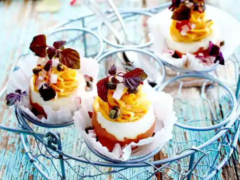 Inject the mixture into the hollowed-out eggs. Roughly chop the capers. Wash, clean and finely dice the radishes. Cut cress from the bed. Arrange eggs and sprinkle with capers, radishes and cress.