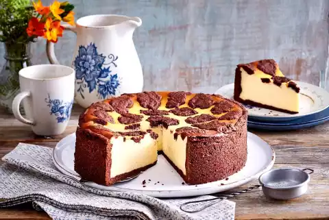 Put the curd mixture into the mould and smooth it down. Knead dough sections together with the rest of the dough, pluck into pieces and press flat. Place the dough on the cream and bake in a preheated oven, lowest shelf (electric cooker: 175 °C/ convection oven: 150 °C/ gas: see manufacturer) for approx. 1 1/4. Cover the cake with parchment paper after 45-60 minutes. Leave the finished cake to rest for 5-10 minutes in a switched-off oven. Then let the cake cool down on a cake rack in the mould. Remove the cake from the tin, lift it onto a cake plate and dust the edge with icing sugar as desired.