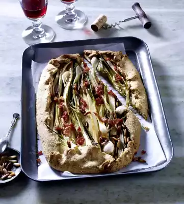 Sprinkle the pine nuts over the top about 5 minutes before the end of the cooking time and bake with them. Remove the tart from the oven and serve immediately.