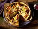 Bake the tart on the lower shelf in a preheated oven (electric oven: 200 °C/ convection oven: 175 °C/ gas: see manufacturer) for 35-45 minutes. Cut the bacon into pieces and spread it on the tart about 10 minutes before the end of the baking time, bake with it.
