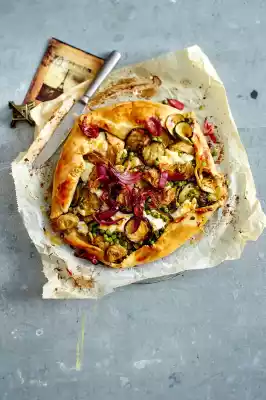 Roll out short pastry on baking paper round (30-32cm Ø). Prick the pastry sheet several times with a fork and sprinkle with approx. 2 tbsp. breadcrumbs. Pull the paper onto a baking tray. Crumble the cheese and mix it with the vegetables. Spread the mixture on the pastry sheet so that a 4-5 cm wide edge remains free all around. Fold the rim all around to the middle over the vegetables. Bake in the preheated oven on the lowest shelf (electric oven: 200 °C/ convection oven: 175 °C/ gas: see manufacturer) for approx. 30 minutes. Whisk 1 egg yolk with cream. Approx. 10 minutes before the end of the baking time, brush the surface of the dough with the cream and bake until done. Remove from the oven and spread caramelized onions on the tart.