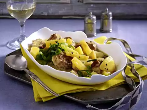 In the meantime peel, wash and cut the potatoes into pieces. Peel turnips and cut into sticks. About 20 minutes before the end of the stewing time, add the potatoes and turnips to the goulash and finish cooking.
