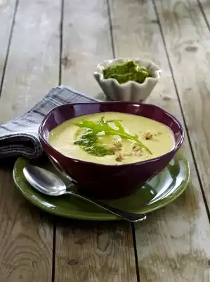 Clean and wash the rocket, put 4 leaves aside for garnishing, chop the rest roughly. Peel garlic clove and chop finely. Grate parmesan finely. Finely mash the walnuts, except for a little for garnishing, 5 tbsp. olive oil, rocket, garlic and Parmesan cheese, season to taste with salt and pepper. Arrange the soup in plates, garnish with walnuts, rocket and pesto.