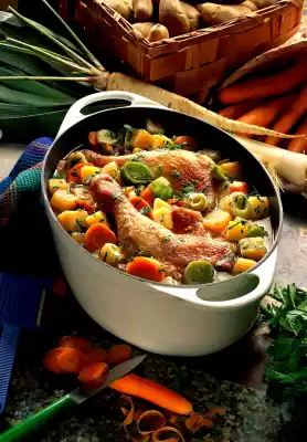Wash the legs, pat them dry and fry them in their own fat in a large casserole dish. Peel, wash and dice the turnip and potatoes. Remove the legs, fry the rutabaga and potatoes in the cooking fat and season with a little salt, pepper and sugar. Add stock and place the legs on top. Bring everything to the boil, cover and stew for about 45 minutes. Peel, wash and slice carrots and parsley root. Clean, wash and cut the leek into rings. Spread on the turnips and cook for another 20 minutes. Wash and chop the parsley and sprinkle over the leek. Season everything again with salt and pepper