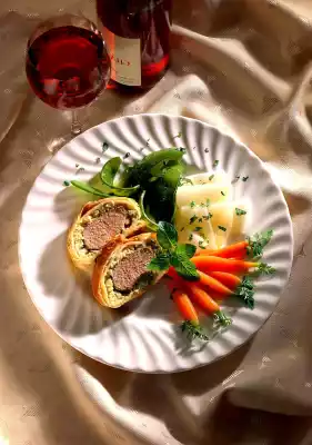 Cut the saddle of lamb from the bone and remove the fat and tendons. Defrost the puff pastry. Finely grate the toast. Grate zucchini roughly. Mix cream cheese, toast and zucchini. Heat clarified butter in a frying pan and fry the meat thoroughly all around so that the pores close and the meat remains juicy. Season with salt and pepper and remove. Place the puff pastry slices on top of each other and roll out to a thickness of approx. 3 mm on a floured work surface. (approx. 30x20 cm). Cut the dough in half crosswise, spread half of the paste on the dough, leaving a rim free. Place the fillets on top and wrap them in the dough, spreading the edges with water so that they stick together. Fold out the dough ends. Place the packet on a baking tray lined with baking paper with the seam facing down. Whisk the egg yolk and coat the dough with it. Bake in a preheated oven (electric: 200 °C/ gas: level 3) for about 20 minutes. The meat is cooked through for 5 minutes longer. In the meantime, clean and wash the sugar peas. Peel the carrots, leaving a little green. Peel kohlrabi and slice into thin slices. Put vegetables in boiling salted water and cook for 5 minutes. Remove the meat and let it rest for 5 minutes. Drain the vegetables. Pluck mint leaves from the stalks and chop finely. Melt butter. Cut the meat open and arrange on plates with the vegetables. Add mint and butter