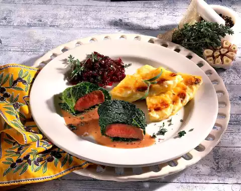 Clean and wash the savoy cabbage leaves and blanch in boiling salted water for about 8 minutes. Remove from the cooking water, rinse with cold water and dab dry. Pluck the thyme leaves from the stalks. Sprinkle the savoy cabbage leaves with thyme. Roll each piece of meat in 2-3 savoy cabbage leaves. Tie together with kitchen string or stick together with skewers. Brush a fat pan of the oven with the remaining oil. Place roulades on top and roast in the preheated oven (electric: 200 °C/ gas: level 3) for 15-20 minutes. Peel and chop the shallot and garlic. Fry them in 20 g hot fat until translucent. Pour on red wine and lamb stock and let it boil down to approx. 300 ml. Mix the starch with some cold water and add to the sauce.