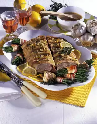 Wash the thyme, remove the leaves and sprinkle on the roast. For the vegetables clean and wash the beans. Cook in boiling salted water for about 15 minutes. Drain well and wrap with bacon in small bundles.
