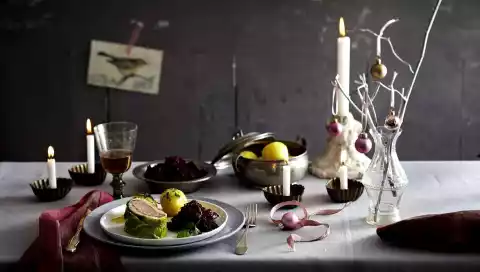 Remove the finished saddle of venison from the oven and leave to rest in the foil for approx. 5 minutes. Remove the foil, cut off the ends if necessary and cut the back into 4 equal pieces. Red cabbage and dumplings are delicious with it.