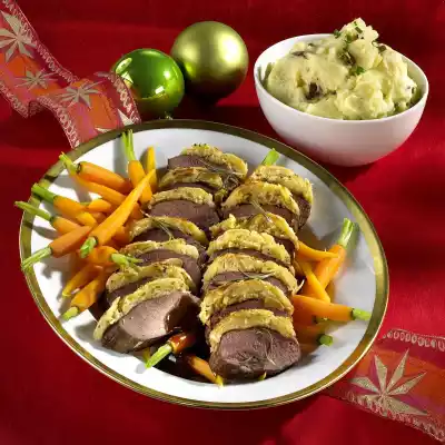 Cut the saddle of venison, arrange on a plate with carrots and sauce and garnish with rosemary sprigs. Serve with mashed potatoes.