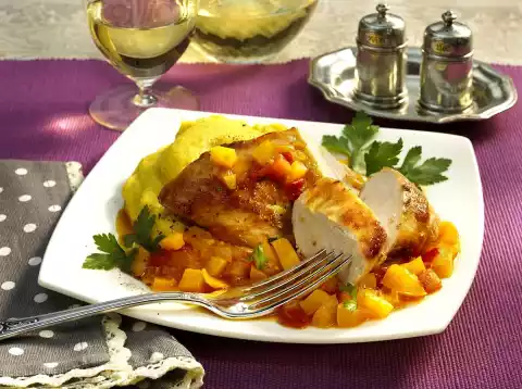 Add paprika, rest onions and tomatoes and steam for about 10 minutes, stirring occasionally. Season to taste with salt, pepper and saffron. Meanwhile wash the meat, dab dry, season with salt and pepper and dust with flour. Heat 1 tablespoon of oil in a pan. Fry the meat for 10-12 minutes until golden brown. Mix polenta well and season with salt and pepper. Arrange polenta, vegetables and chicken filets on plates and garnish with parsley
