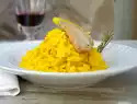 Dissolve the stock in a good 1 l boiling water. Stir in saffron, keep hot. Peel onion and chop very finely. Heat the oil in a large pot. Fry the onion in it until transparent. Add rice and roast for 1-2 minutes while stirring until the rice grains start to "crackle".