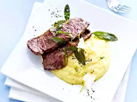Wash the meat, dab dry and season with salt. Heat the oil in a large pan and fry the meat for about 3 minutes while turning. Season with pepper. Remove the steaks, wrap them in aluminium foil and let them rest. Fry sage briefly in the frying fat, remove and dissolve frying set with lime juice and 4 tbsp. water. Add lime zest. Stir in butter. Arrange polenta and steaks with sage and lime sauce. Sprinkle with parmesan