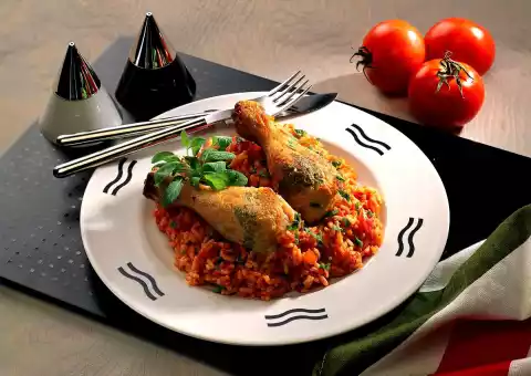 Fry over medium heat for about 12 minutes. Finely chop remaining sage leaves and sprinkle over the risotto. Arrange chicken legs on top. Garnish as desired with a sprig of sage.