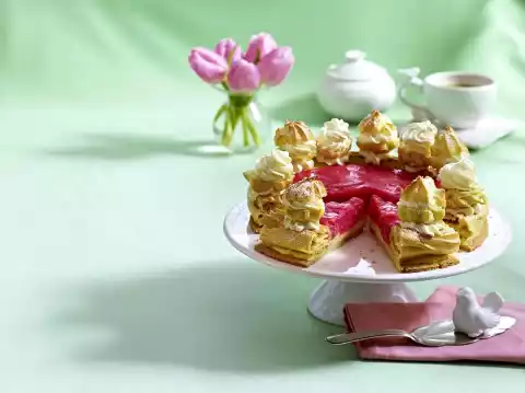 Clean, wash and cut the rhubarb into pieces. Mix with 100 g of sugar and let the juice steep for about 30 minutes. Meanwhile take 2-3 tbsp. of the milk and mix with the pudding powder. Boil up the remaining milk and 2-3 tbsp. sugar. Add the pudding powder while stirring and bring to the boil again and simmer for about 1 minute. Put the shortcrust pastry base on a cake plate, spread thinly with hot pudding. Place a choux pastry ring on top. Fill in the rest of the pudding, smooth it down and put it in a cool place