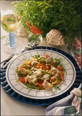 Add the peas and corn to the onions and stew for 5 minutes. Fold in tomato wedges and season with salt and pepper. Mix vegetables and fish pieces and season to taste. Arrange on a preheated plate, sprinkle with cheese cubes and garnish with tarragon leaves as desired.