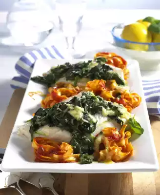 Mix the cheese with the spinach and spread on the fish. Cover and bake in the preheated oven (electric cooker: 200 °C/ convection oven: not suitable/ gas: level 2) on the lower rack for approx. 10 minutes. Cook for another 6-8 minutes without lid.