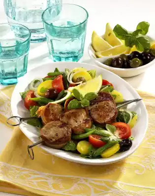 The salad is easy to prepare and is also perfect for your barbecue party. Simply fry the fillet skewers on the grill