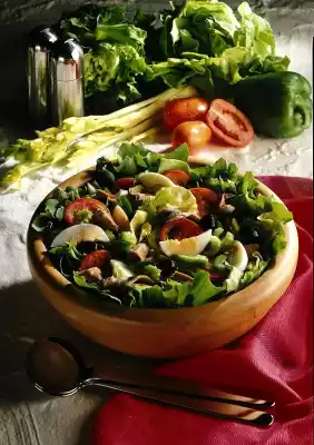 Clean, wash and pluck the salad into bite-sized pieces. Clean, wash and cut the celery and bell peppers into strips. Wash, clean and slice the tomatoes. Drain tuna and olives.