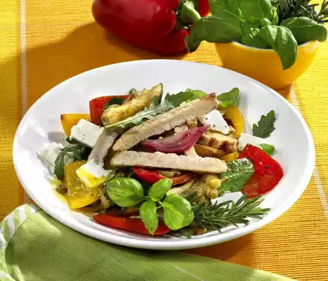 Fold in 6 tablespoons of oil. Mix with lentils and leave to stand. Fry meat in remaining oil in a grill pan for 3-4 minutes on each side, season with salt and pepper and cut into strips. Mix vegetables, rocket and lentil vinaigrette. Crumble the feta and pour over the salad with the meat. Garnish with basil