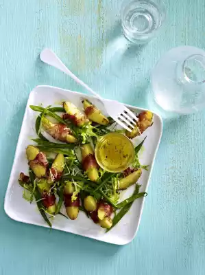 Wash the thyme, shake dry and chop finely. Mix lemon juice, honey and thyme. Season with salt and pepper. Quench potatoes in cold water. Cut the pancetta into wide strips, quarter the potatoes and wrap them with the pancetta