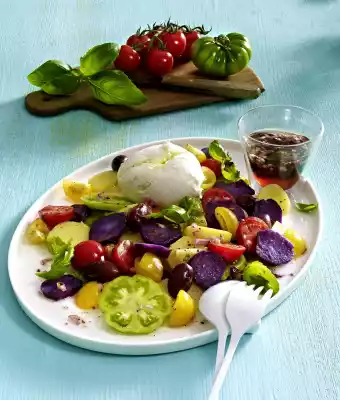 Mix the potatoes, tomatoes and remaining olives. Arrange on plates and sprinkle with the vinaigrette. Sprinkle with coarse pepper. Add mozzarella balls and garnish with basil