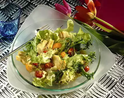 Mix the artichokes, lettuce and tomatoes with the marinade and arrange on plates. If necessary, add baked baguette