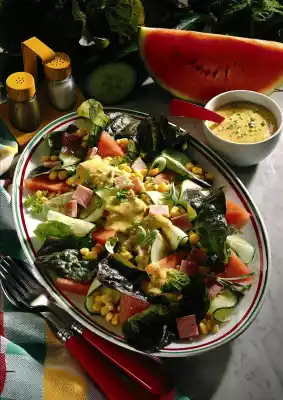 Clean and wash the salad and tear it into pieces. Drain the corn. Cut the melon into slices, remove the flesh from the skin, possibly remove the seeds and cut into pieces. Wash the cucumber and slice thinly. Dice ham