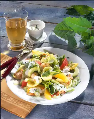 Wash the chicory and cut into strips. Wash and dry the salad vegetables and chop or pluck them. Wash chives and cut into fine rings
