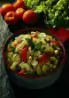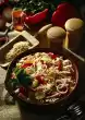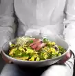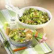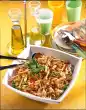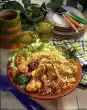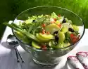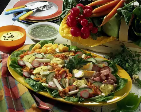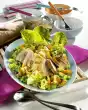 Peel and chop onion. Wash herbs and chop finely. Mix vinegar, salt, pepper and sugar. Whip oil into it. Fold in onion and herbs. Mix sour cream, lemon juice and apricot jam. Season to taste with salt. Add peppercorns. Line a plate with salad leaves. Mix salad ingredients and arrange on top. Spread some apricot sauce on top.