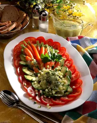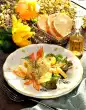 Sprinkle the zucchini cubes on top and serve the salad plate sprinkled with parsley and coloured pepper. Add the rest of the potato vinaigrette separately.
