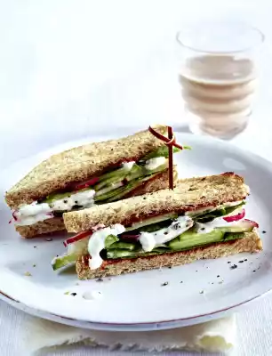Spread yoghurt dressing on top. Cover with remaining toast slices. Cut the sandwich diagonally, arrange on plates and sprinkle with black pepper from the mill as desired. Serve with a glass of almond drink