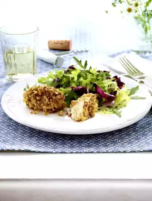 Fill nuts into a freezer bag and crush them finely with a dough roll. Pour onto a flat plate. Turn cream cheese gnocchi in the nuts. Marinate salad with dressing. Arrange on plates with the bung cheese pralines. Garnish with daisies