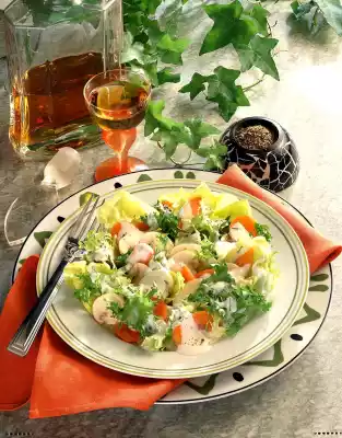 Wash lettuce and frisée and pluck into small pieces. Peel and slice the carrots. Clean, wash and slice the mushrooms. Mix buttermilk and quark, season with coloured pepper and salt. Mix all ingredients