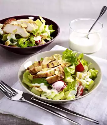 Cut the chicken into slices. Arrange salad and chicken on plates, drizzle with some dressing, sprinkle with almonds. Add dressing
