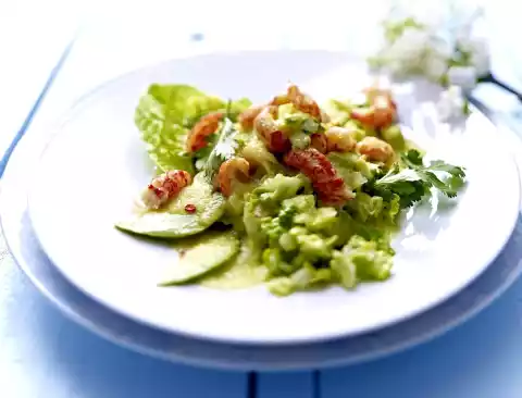 Arrange lettuce leaves and avocado slices on 4 plates. Arrange the salad on top, place the crayfish on top and garnish with the remaining coriander.