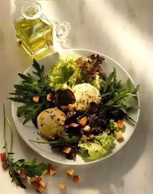 Clean and wash the rocket and salad and cut into bite-sized pieces. Mix vinegar, salt and pepper, add remaining oil. Arrange rocket, salad and goat cheese on four plates. Sprinkle with the toast cubes