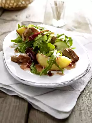 Wash and clean the rocket and salad, shake dry. Pluck the lettuce into bite-sized pieces. Mix ingredients carefully, arrange and sprinkle with dressing. Bread tastes good with it.