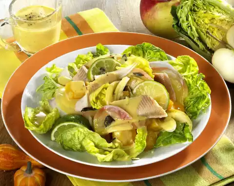 Mix prepared ingredients and oil carefully. For the sauce mix vinegar and mustard. Season to taste with salt, pepper and sugar. Dribble the sauce over the salad. Serve sprinkled with roughly chopped pumpkin seeds. Serve garnished with lime
