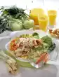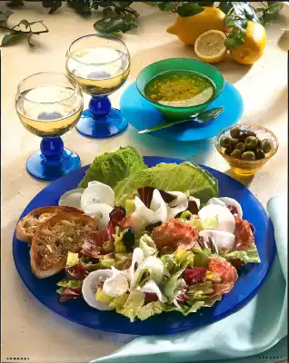 Clean, wash and cut the salad into bite-sized pieces. Peel the radish and cut it into spirals with a radish knife. Peel and finely dice shallots. Mix vinegar, salt and pepper, add 4 tablespoons of olive oil. Mix salad, radish, salami, olives and marinade.