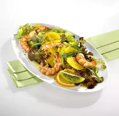 Fold in 1 tablespoon of oil. Mix the prepared salad ingredients and marinade and leave to stand. Wash the shrimps and pat dry. Fry for approx. 3 minutes in 1 tablespoon of hot oil while turning. Season with salt and pepper and serve on the salad