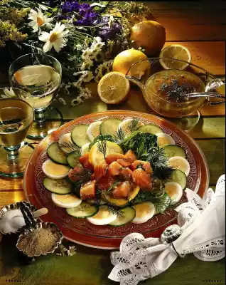 Boil eggs hard in about 10 minutes. Cold quench, peel and cut into thin slices. Wash the cucumber and also cut it into thin slices. Cover plate alternately with cucumber and egg slices.