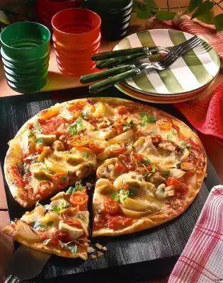 Allow to cool a little, then pour onto the pizza base. Clean, wash and halve the cherry tomatoes. Drain the artichoke hearts, also cut in half. Cover pizza with salami, artichoke hearts and cherry tomatoes.