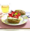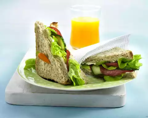 Cover with 1 lettuce leaf, cucumber slices and salami. Fold the slices of toast and cut in half diagonally. Serve with multivitamin juice.