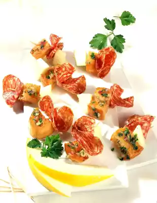 Cut bread into cubes. Heat the fat. Briefly sauté the onion-garlic mixture in it. Add bread cubes and fry until crispy all around. Remove seeds from melon and peel. Cut the flesh into cubes. Put bread cubes, melon and salami alternately on small wooden skewers